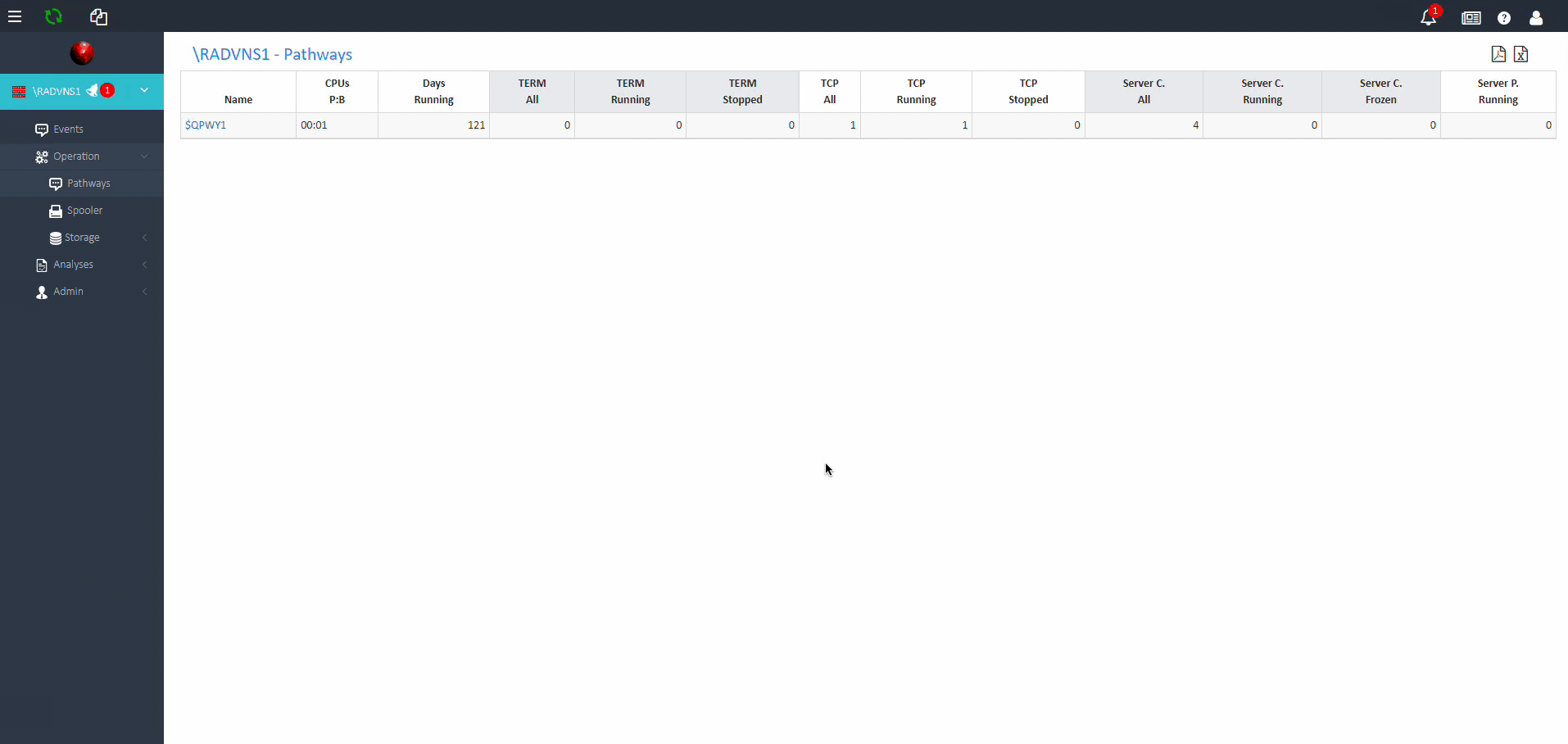 This is where you have a command interface to Pathway environments on your Server. Clicking on Pathways shows the overall summary of all running Pathways present on the Server. On the summary page, Server Classes All reflects the SUM (SC Thawed, SC Running, SC Stopped). If you go to Server and perform quick command for Server – Status ALL, then you will find this on the detail page.