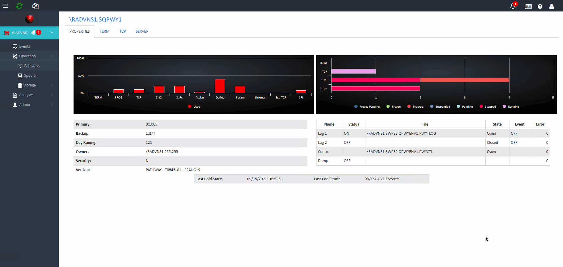 Clicking on the name of a Pathway (on the left panel) populates the right panel with detailed information of that Pathway under Properties Tab. Three other Tabs: TERM, TCP (Terminal Control Process), and SERVER, give you access to issue Commands.